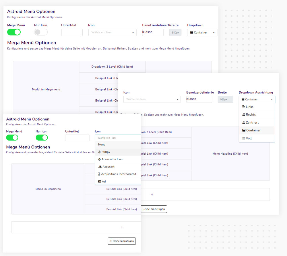 Sobald Sie mit diesen Einstellungen fertig sind, können Sie Ihr eigenes Mega-Menü für einzelne Menüpunkte erstellen. Die Struktur der Menüelemente der Hauptebene entspricht der Struktur Ihres Joomla-Menüs. Standardmäßig werden alle Untermenüelemente automatisch als Dropdown-Menüelemente angezeigt.